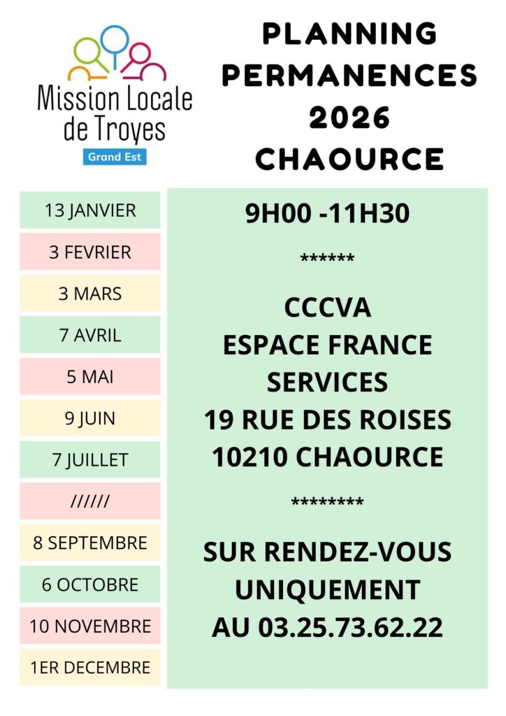 • CHAOURCE : le 1er mardi du mois de 14h30 à 17h sur rendez-vous ; dans les locaux de la Communauté de Communes du Chaourçois et du Val d’Armance, 19 rue des Roises à Chaource. Tél. : 03 25 40 16 91.