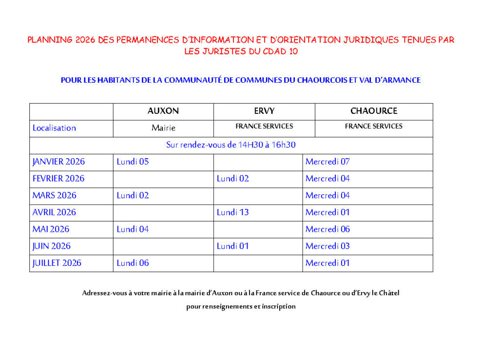 Des permanences sont organisées à Ervy-Le-Châtel les lundis 27/01/2025, 17/02, 17/03, 14/04, 26/05 et 23/06, uniquement sur rendez-vous.